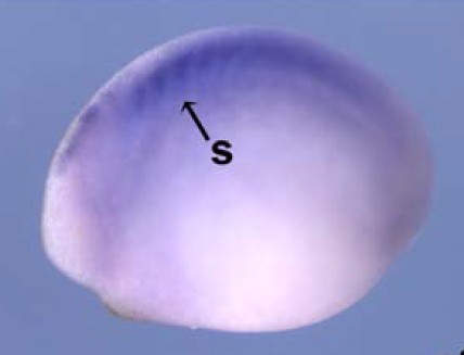 casz1 (castor zinc finger 1) gene expression in Xenopus tropicalis embryo, assayed via in situ hybridization, NF stage 22, lateral view, dorsal up, anterior left. This image is extracted from figure published in: Christine KS and Conlon FL (2008), Image published in: Christine KS and Conlon FL (2008) Copyright © 2008. Image reproduced with permission of the Publisher, Elsevier B. V.