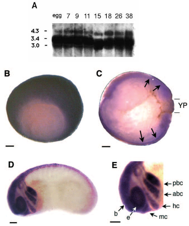 Fig. 2. Developmental expression of Xenopus Mad. (A) A developmental northern blot of total embryonic RNA shows that XMad is maternal and expressed at all stages of early development. Three transcripts are detected with the sizes (in kb) indicated on the left. The most abundant mRNA is 3.4 kb, and minor transcripts of 4.3 kb and 3.0 kb are also detected. It is not known whether these transcripts derive from closely related genes or splicing variants. Lane numbers correspond to developmental stages (Nieuwkoop and Faber, 1967): (7, 9) blastula, (11) gastrula, (15, 18) neurula, (26) tailbud tadpole and (38) swimming tadpole. (B) In situ hybridization shows that XMad transcripts are uniformly distributed in the early gastrula (stage 10). Dense staining covers the entire prospective ectoderm and marginal zone, but vegetal cells (the lighter region) do not stain efficiently by this procedure (Harland, 1991). A northern blot on isolated dorsal, ventral, animal and vegetal regions confirmed the uniformity of XMad expression at early stages (not shown). (C) A mid-gastrula embryo (stage 12) split sagitally reveals that XMad is expressed in the ectoderm and neurectoderm (arrows mark the ectodermal-mesodermal boundary), and expression in the underlying mesoderm is greater in the posterior, adjacent to the yolk plug (YP). This embryo is lightly pigmented and the brown line anterior to the yolk corresponds to involuted bottle cells. The embryo is positioned with the anterior to the left and dorsal at the top. (D) At tailbud tadpole stage 26 XMad expression is high in the central nervous system and head. (E) A close-up of the head of the embryo in D, highlighting XMad expression in the brain (b), eye (e) and head neural crest derivatives (mc, mandibular crest; hc, hyoid crest; abc, anterior branchial crest; pbc, posterior branchial crest). Expression in the otic vesicle, between the hyoid crest and anterior branchial crest, is also visible. Scale bars, 0.1 mm.
