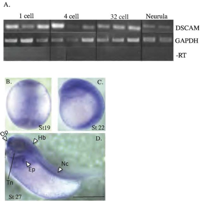 tropicalis embryos using an XtDSCAM-specific probe. Arrows