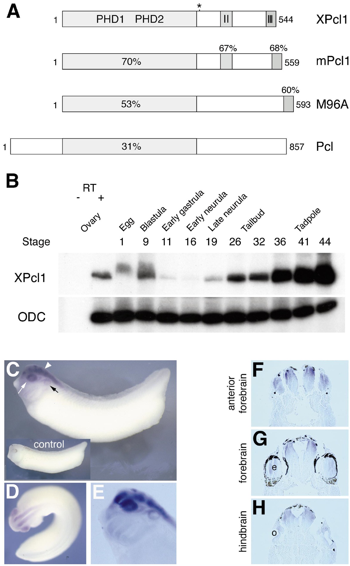 and ODC (32 cycles, 234 bp). XPcl1 antisense probe was used for whole-mount RNA in situ hybridization (CâH). XPcl1 expression is