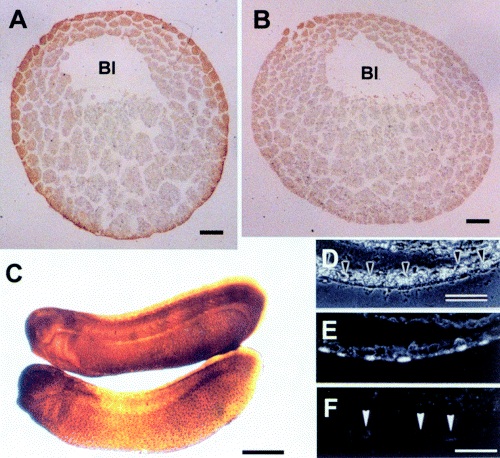 Figure 3. Spatial distribution of the 38 kDa protein by immunocytochemistry. After whole-mount staining, embryos were embedded in paraplast and sectioned in A and B. Top, animal poles. Bl, blastocoele. (A) The 38 kDa protein is localized by 9D10 antibody preferentially in the superficial layer of the animal cap, the marginal zone and the vegetal yolk cell mass of the mid-blastula (stage 8), although a very small amount of the protein seems to be ubiquitously present throughout the cytoplasm of almost all cells. A similar localization of the protein was also observed in polyester wax sections of embryos at the same stage stained with the antibody, implying that the localization in the layer was not caused by poor penetration of the antibody. (B) Control rat IgM antibody detects no significant localization of proteins. (C) Whole-mount staining of a mid-tailbud stage embryo (stage 27). The localization of the 38 kDa protein is stained as dots on the epidermis when the embryo was reacted with the 9D10 antibody (bottom). Such a characteristic staining is not observed when control rat IgM antibody was used (top). (D) Phase contrast image of the epidermis on a transverse section of a mid-tailbud embryo (stage 28). Arrowheads indicate ciliated epidermal cells. (E) The same section as in D stained with the 9D10 antibody. The 38 kDa protein is localized in the apical region of ciliated epidermal cells. (F) Control rat IgM antibody detects no staining in the ciliated epidermal cells (white arrowheads) on a similar section. Bars, 10 μm in (A) and (B), 500 μm in (C), and 50 μm in (D) and (F). Image published in: Tanaka TS and Ikenishi K (2002) Copyright © 2002. Image reproduced with permission of the Publisher, John Wiley & Sons.