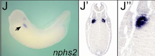 nphs2 (nephrosis 2, idiopathic, steroid-resistant (podocin)) gene expression in Xenopus laevis embryo, assayed via in situ hybridization, NF stage 35 & 36, lateral view, anterior left, dorsal up, and in tranverse section through pronephric kidney, in low (J')and high (J") magnification. Image published in: White JT et al. (2010) Copyright © 2010. Image reproduced with permission of the Publisher and the copyright holder. This is an Open Access article distributed under the terms of the Creative Commons Attribution License.
