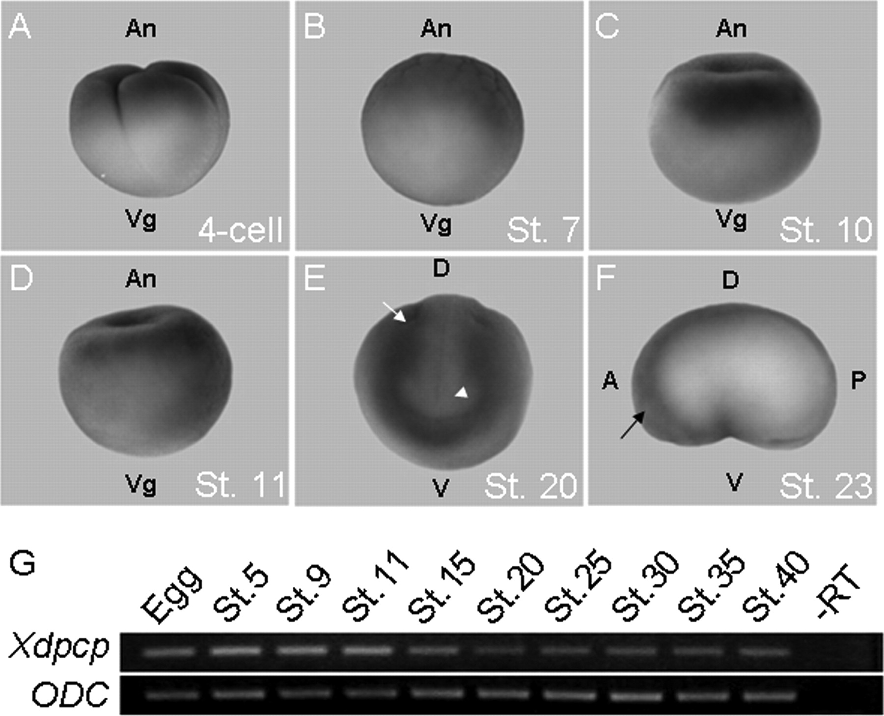The spatial and temporal expression patterns of xdpcp. AâD, lateral views of the cleavage, blastula, and gastrula stage embryos showing xdpcp expressed in the animal regions. E, anterior view of a neurula stage embryo with dorsal at the top. The white arrow and arrowhead indicate the paraxial mesoderm and anterior neural plate region. F, lateral view of a tailbud stage embryo with anterior at the left. The black arrow indicates the head region. G, RT-PCR analysis showing the temporal expression patterns of xdpcp in Xenopus early development. Stages are indicated above the lanes. Ornithine decarboxylase (ODC) serves as a loading control. The PCR cycles consisted of denaturation at 94 °C for 1 min, annealing at 55 °C for 1 min, and extension at 72 °C for 1 min for 25 cycles. An, animal; Vg, vegetal; D, dorsal; V, ventral; A, anterior; P, posterior. Image published in: Cheong SM et al. (2009) Copyright © 2009. Image reproduced with permission of the Publisher and the copyright holder. This is an Open Access article distributed under the terms of the Creative Commons Attribution License.