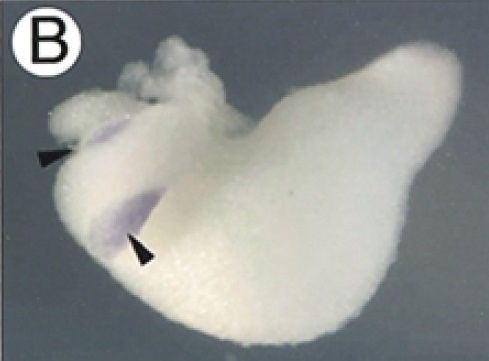 cel (carboxyl ester lipase) gene expression in dissected Xenopus laevis gut, assayed via in situ hybridization, NF stage 42, lateral view, anterior left, dorsal up. This image is extracted from figure published in: Sogame A et al. (2003), Image published in: Sogame A et al. (2003) Copyright © 2003. Image reproduced with permission of the Publisher, John Wiley & Sons.