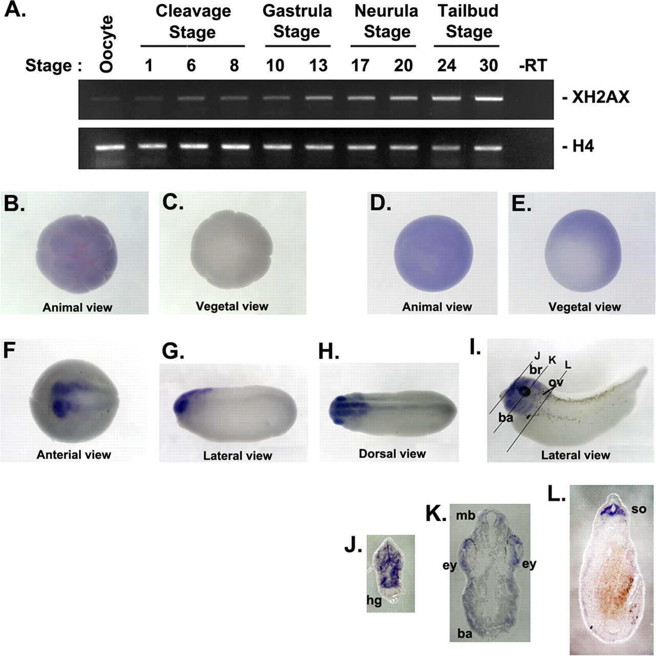 FIGURE 1. Temporal and spatial expression profile of XH2AX during embryogenesis. A, RT-PCR analysis of temporal mRNA expression of XH2AX. Developmental stages are indicated above each lane. Histone H4 served as a loading control. −RT, control reaction without reverse transcriptase. B–I, whole-mount in situ hybridization showing the spatial expression of XH2AX during early Xenopus development. B and C, blastula stage: animal hemisphere view (B) and vegetal hemisphere view (C); D and E, gastrula stage: animal hemisphere view (D) and vegetal hemisphere view (E); F, neurula stage: anterior view with posterior right; G and H, tail bud stage: lateral view with anterior left (G) and dorsal view with anterior left (H); I, stages 33–34. The black lines represent the angle of sectioning for J–L. J–L, transverse section through a stage 33–34 embryo stained by whole-mount in situ hybridization for XH2AX mRNA. ba, branchial arches; br, brain; ey, eye; hg, hatching gland; mb, midbrain; ov, otic vesicle; so, somite.