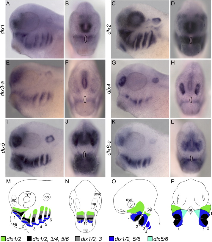 Fig. 1. dlx Expression in X. laevis at st. 33/34. Lateral views with anterior to left (A, C, E, G, I and K) and anterior views (B, D, F, H, J and L) of larvae stained by ISH for (A and B) dlx1, (C and D) dlx2, (E and F) dlx3-a, (G and H) dlx4, (I and J) dlx5, and (K and L) dlx6-a. The position of the stomodeum is indicated by an oval in all anterior views. (MâP) Schematic of dlx expression in the X. laevis (M and N) and mouse (O and P) cranial neural crest cells. See figure for key. Lateral views in (M) and (O), anterior views in (N) and (P). For X. laevis, the ventral blue domain is shown with grey stripes to indicate the expression of dlx3 in this region weakly. For mouse, data were used from both Jeong et al., 2008 and Depew et al., 2002. cg, cement gland; np, nasal placode; op, otic placode; st, stomodeum. Each PA is labeled by number. Image published in: Square T et al. (2015) Copyright © 2015. Image reproduced with permission of the Publisher, Elsevier B. V.