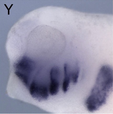 barx1 (BARX homeobox 1) gene expression in Xenopus laevis embryo, assayed via in situ hybridization, NF stage 34, lateral view, anterior left, dorsal up. This image is extracted from figure published in: Square T et al. (2015), Image published in: Square T et al. (2015) Copyright © 2015. Image reproduced with permission of the Publisher, Elsevier B. V.