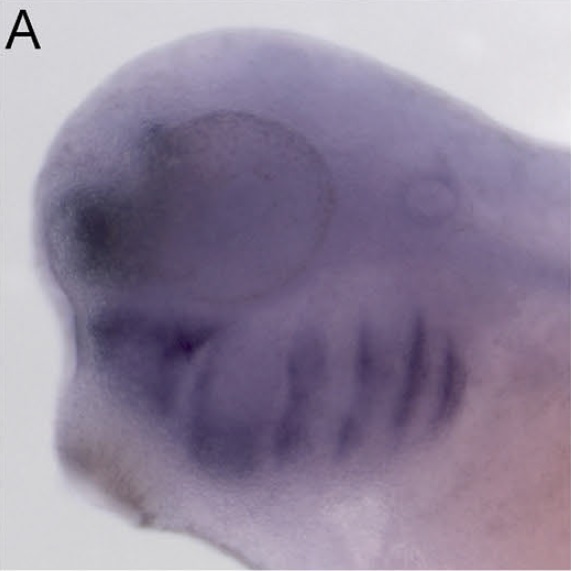 dlx1 (distal-less homeobox 1) gene expression in Xenopus laevis embryo, assayed via in situ hybridization, NF stage 34, lateral view, anterior left, dorsal up. This image is extracted from figure published in: Square T et al. (2015), Image published in: Square T et al. (2015) Copyright © 2015. Image reproduced with permission of the Publisher, Elsevier B. V.