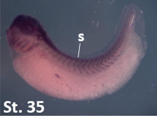 frs3 (fibroblast growth factor receptor substrate 3) gene expression in Xenopus laevis embryo, assayed via in situ hybridization, NF stage 35, lateral view, anterior left, dorsal up. This image is extracted from figure published in: Kim YJ et al. (2015), Image published in: Kim YJ et al. (2015) Copyright © 2015. Image reproduced with permission of the Publisher, Elsevier B. V.
