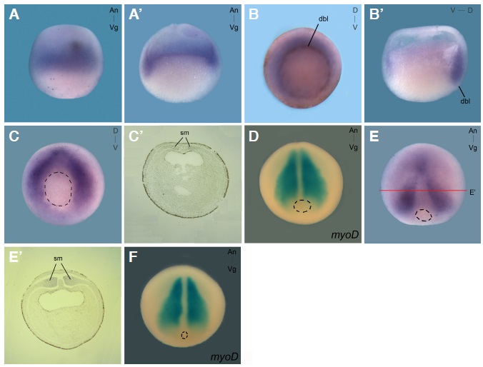 Fig. 2. zcchc24 expression from blastula to gastrula stages. Whole mount in situ hybridization using DIG labelled zcchc24 (A-Câ, E,Eâ) or fluorescein labelled myoD (D,F) was performed on embryos from blastula to gastrula stages. (A,Aâ) At blastula stages, zcchc24 is expressed as a ring around the marginal zone in both dorsal and ventral sides. The embryos display the animal hemisphere to the top. (B,Bâ) In the beginning of gastrulation (st 10.5), zcchc24 expression is restricted to the dorsal mesoderm in both involuting and non-involuting marginal zone. (C,Câ, E,Eâ) At late gastrula (st 11 and 12), zcchc24 transcripts are detected in two lateral mesoderm stripes around the blastopore that culminate in the dorsal mesoderm, the somitogenic mesoderm, but is excluded from the midline. (D,F) myoD is expressed in the somitogenic mesoderm. (Aâ , Bâ) Hemisections of (A,B), respectively. (Câ, Eâ) Transverse sections of st 11 and st 12 embryos, respectively, with dorsal side displayed to the top. (B,C) Vegetal views. (D,E,F) Dorsal views. Dashed lines delimitate the blastopore. An, animal; Vg, vegetal; D, dorsal; V, ventral; dbl, dorsal blastopore lip; sm, somitogenic mesoderm. Image published in: Vitorino M et al. (2014) Copyright © 2014. Image reproduced with permission of the Publisher.