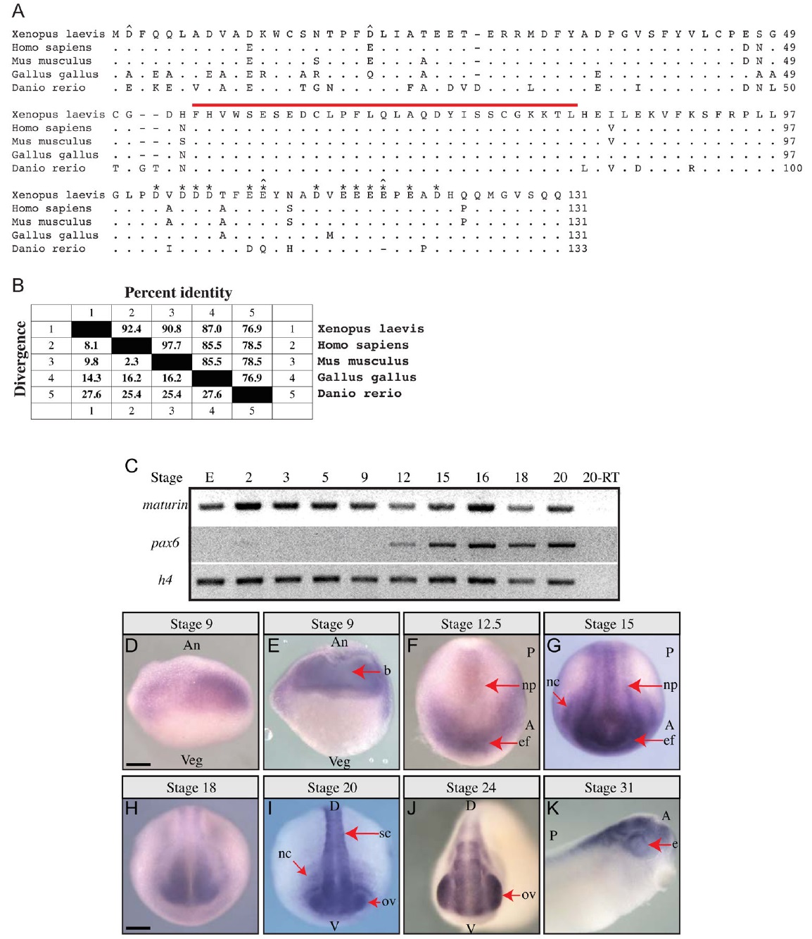 developmental stage. Histone h4 was used as a loading control. (DâK) Maturin expression in developing embryos. Whole mount in situ hybridization was used to detect Xenopus laevis