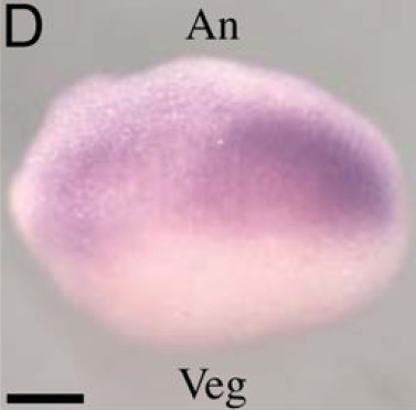 mturn (maturin, neural progenitor differentiation regulator homolog) gene expression in Xenopus laevis embryo, assayed via in situ hybridization, NF stage 9, horizontal view, animal up.