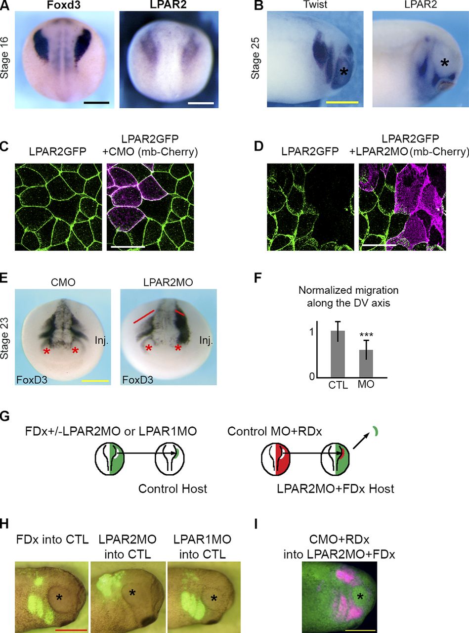 Figure 1. LPAR2 signaling is required for in vivo NC migration. (A) In situ hybridization for Foxd3 and LPAR2. (B) In situ hybridization for Twist and LPAR2. Asterisks indicate eyes. (C) Control Morpholino coinjected with membrane-mCherry into animal caps expressing 5â²UTR-LPAR2GFP. (D) LPAR2 Morpholino coinjected with membrane-mCherry into animal caps expressing 5â²UTR-LPAR2GFP. Note the absence of LPAR2-GFP fluorescence in the cell injected with LPAR2MO. (E) Frontal view of embryos injected with Control MO (CMO) or LPAR2MO, Foxd3 in situ hybridization. Asterisks, eyes; Inj., injected side; red lines, normal migration in control side. (F) LPAR2MO-injected embryos have NC migration defects (41 embryos were analyzed). Studentâs t test (two-tailed): ***, P < 0.005; errors bars indicate SD. (G) Grafting procedure. (H) Graft of control (left) or LPAR2MO (middle) or LPAR1MO cells (right) labeled with FDx (green) into host embryos. (I) Graft of control NC cells labeled with rhodamine-dextran (RDx, red) into LPAR2MO host (FDx, green). Bars: (A, B, E, H, and I) 0.5 mm; (C and D) 100 µm. Image published in: Kuriyama S et al. (2014) © 2014 Kuriyama et al. Creative Commons Attribution-NonCommercial-ShareAlike license