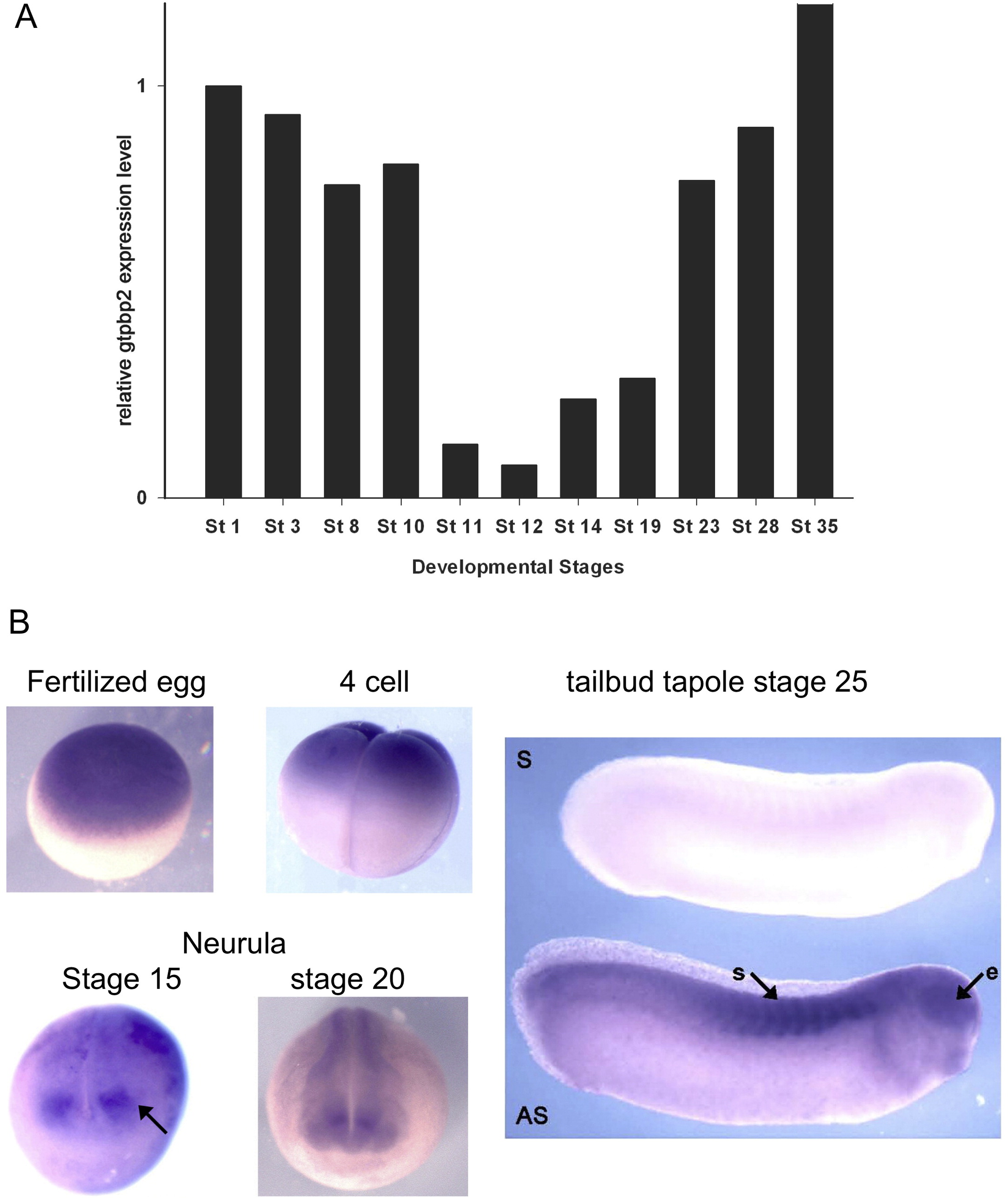 Analysis of Gtpbp2 temporal expression by quantitative RT-PCR and whole mount in situ hybridization. (A) Gtpbp2 transcripts were quantified across developmental stages, with expression levels normalized to the housekeeping gene ornithine decarboxylase (odc) and shown in arbitrary units by setting the expression level of a fertilized egg (Stage1) to 1. Gtpbp2 expression significantly decreases during gastrulation. Stage 11 corresponds to mid-gastrulation and stage 12 corresponds to late gastrulation. (B) Whole mount in situ hybridization on staged embryos, confirming the localization of gtpbp2 transcripts to the animal pole of the egg and early cleaving 4-cell blastula. Neurula stage expression is weak but enriched in neural folds at early (stage 15) and late (stage 20) neurula. Stage 25, early tailbud tadpole expression of gtpbp2 is most prominent in the somites (s) and eye (e), with enrichment in the central nervous system (cns). A sense strand RNA in situ probe was hybridized to the tadpole at top, and an antisense probe was hybridized to the tadpole at bottom. Image published in: Kirmizitas A et al. (2014) Copyright © 2014. Image reproduced with permission of the Publisher, Elsevier B. V.
