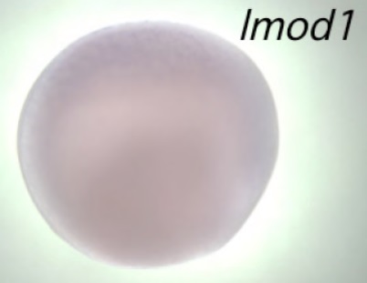 lmod1 (leiomodin 1 (smooth muscle)) gene expression in Xenopus laevis embryo, assayed via in situ hybridization, NF stage 15, lateral view, anterior left, dorsal up.