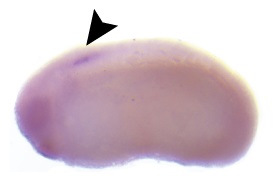 uts2b (urotensin 2B) gene expression in Xenopus laevis embryo, assayed via in situ hybridization, NF stage 24, lateral view, anterior left, dorsal up. This image is extracted from figure published in: Bougerol M et al. (2015), Image published in: Bougerol M et al. (2015) Image reproduced on Xenbase with permission of the publisher and the copyright holder. Creative Commons Attribution license