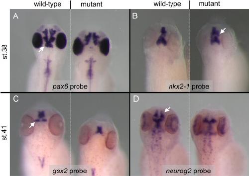 Fig. 7. pax6 mutants display altered forebrain patterning. In situ hybridization comparison of expression patterns of several genes show altered brain patterns in mutant versus wild-type embryos. pax6 mRNA expression is lost from the pretectum (white arrow) and ventral thalamus of mutants, but appears to be maintained normally in more anterior parts of the forebrain including retina at stage 38 (A). By contrast, as seen in panel (B) the expression domain of nkx2-1 appears to be expanded in the telecephalon (white arrow) of pax6 mutants compared to wild-type. gsx2 expression is lost from the prethalamus (C, white arrow) of the mutant, and neurog2 is greatly reduced in the telencephalon (D, white arrow) of mutant embryos.