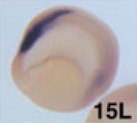 rpl 32 (ribosomal protein L32) gene expression in Xenopus laevis embryo, assayed via in situ hybridization, NF stage 15, lateral view, anterior left, dorsal up.