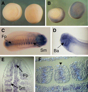 Fig. 1. SMRT is expressed predominantly in the head and somites of the tailbud Xenopus embryo. (A, B) In situ hybridization of gastrula stage embryos using (A) sense and (B) antisense SMRT RNA probes. (C) Dorsal view of a wholemount in situ hybridization of an early tailbud embryo (stage 26) using an antisense SMRT probe (anterior to right). There is significant staining in the head and posterior floorplate (Fp). Lateral stripes correspond to the position of the somites (Sm) and expression is also seen in the posterior mesoderm that has yet to segment. (D) In the late tailbud (stage 32) embryo, expression is predominantly within the head in the branchial arches (Ba) and eyes. (E) Planar longitudinal section through a tailbud embryo (posterior to the top) showing the expression of SMRT in the somites (Sm) and in the floor plate (Fp) of the posterior neural tube. (F) Highlighting the nuclei within the cells of a somite using Hoechst stain shows that SMRT mRNA has a perinuclear distribution (arrowed).