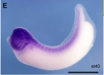 nf2 (NF2, moesin-ezrin-radixin like (MERLIN) tumor suppressor ) gene expression in Xenopus laevis embryo, assayed via in situ hybridization, NF stage 40, lateral view, anterior left, dorsal up. Image published in: Zhu X et al. (2015) Copyright © 2015. Image reproduced with permission of the Publisher, Elsevier B. V.