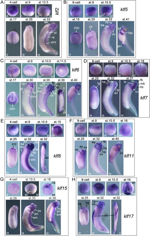 Figure 2. AâH: Spatial expression patterns klf2 (A), klf5 (B), klf6 (C), klf7 (D), klf8 (E), klf11 (F), klf15 (G), and klf17 (H) during Xenopus embryogenesis detected with whole mount in situ hybridization. a, animal view; aa, aortic arches; ad, adenohypophysial placode; an, anterior view, dorsal is up; ba, branchial arches; bl, blastopore lip; cg, cement gland; d, dorsal view, the anterior is up; da, dorsal anterior view; dv, dorsal vegetal view; ey, eye; fb, forebrain; fep, facial epibranchial placode; hb, hindbrain; he, heart anlage; hg, hatching gland; hm, hypaxial muscles; is, intersomitic vessels; l, lateral view, the animal pole is up; la, lateral view, the anterior is up and the ventral is to the left; ld, lateral dorsal view, the animal pole is up; le, lens; li, liver primordium; lu, lung primordium; mb, midbrain; nc, neural crest; np, neural plate; op, olfactory placode; ov, otic vesicle; pcv, posterior cardinal vein; pl, plexus; pn, pronephros; pop, presumptive olfactory placode; ppe, preplacodal ectoderm; prp, preplacodal region; pt, proctodeum; sd, primordia of stomach/duodenum; sm, somite; tg, trigeminal placode; v, ventral view, the anterior is up; vbi, ventral blood island; vg, vegetal view, the dorsal is up. (Xenbase curators note: gene expression is curated in separate images for each panel/ klf gene- see XB article page for isolated images). Image published in: Gao Y et al. (2015) Copyright © 2015. Image reproduced with permission of the Publisher, John Wiley & Sons.Gene Synonyms Species Stage(s) Tissue klf5.L bteb2, cklf, iklf X. laevis Throughout NF stage 10.5 embryo dorsal upper blastopore lip klf6.L bcd1, cba1, copeb, cpbp, gbf, klf6-a, klf6-b, pac1, st12, zf9 X. laevis Throughout NF stage 10.5 dorsal marginal zone marginal zone involuting marginal zone upper blastopore lip klf2.L lklf, Xklf2 X. laevis Throughout NF stage 10.5 ectoderm animal cap mesoderm klf7.L uklf X. laevis Throughout NF stage 10.5 embryo klf8.L LOC108700053 X. laevis Throughout NF stage 10.5 animal hemisphere klf11.L tieg3 X. laevis Throughout NF stage 10.5 upper blastopore lip dorsal embryo klf15.L X. laevis Throughout NF stage 10.5 dorsal embryo klf17.L klf17.1, neptune, zfp393, znf393 X. laevis Throughout NF stage 10.5 animal hemisphere animal cap klf6.L bcd1, cba1, copeb, cpbp, gbf, klf6-a, klf6-b, pac1, st12, zf9 X. laevis Throughout NF stage 11.5 marginal zone dorsal marginal zone involuting marginal zone upper blastopore lip dorsal embryo klf5.L bteb2, cklf, iklf X. laevis Throughout NF stage 15 preplacodal ectoderm anterior placodal area klf8.L LOC108700053 X. laevis Throughout NF stage 15 neural plate neuroectoderm klf11.L tieg3 X. laevis Throughout NF stage 16 neural plate anterior neural fold neuroectoderm non-neural ectoderm klf17.L klf17.1, neptune, zfp393, znf393 X. laevis Throughout NF stage 16 pre-chordal neural plate border cement gland primordium hatching gland klf6.L bcd1, cba1, copeb, cpbp, gbf, klf6-a, klf6-b, pac1, st12, zf9 X. laevis Throughout NF stage 17 preplacodal ectoderm anterior placodal area neural groove neural plate klf2.L lklf, Xklf2 X. laevis Throughout NF stage 17 embryo anterior dorsal klf7.L uklf X. laevis Throughout NF stage 18 dorsal embryo klf15.L X. laevis Throughout NF stage 18 cement gland primordium klf7.L uklf X. laevis Throughout NF stage 25 trigeminal placode klf8.L LOC108700053 X. laevis Throughout NF stage 25 preplacodal ectoderm anterior placodal area klf11.L tieg3 X. laevis Throughout NF stage 25 neural crest otic vesicle optic vesicle klf17.L klf17.1, neptune, zfp393, znf393 X. laevis Throughout NF stage 25 hatching gland cement gland primordium klf2.L lklf, Xklf2 X. laevis Throughout NF stage 26 embryo anterior klf15.L X. laevis Throughout NF stage 26 embryo klf5.L bteb2, cklf, iklf X. laevis Sometime during NF stage 28 to NF stage 41 epibranchial placode facial epibranchial placode foregut stomach duodenum proctodeum trigeminal placode klf6.L bcd1, cba1, copeb, cpbp, gbf, klf6-a, klf6-b, pac1, st12, zf9 X. laevis Sometime during NF stage 29 and 30 to NF stage 40 posterior cardinal vein trigeminal placode cement gland vascular plexus spinal cord brain forebrain midbrain klf7.L uklf X. laevis Throughout NF stage 32 heart trigeminal ganglion adenohypophyseal placode forebrain telencephalon intersomitic region pharyngeal region klf8.L LOC108700053 X. laevis Throughout NF stage 32 ventral blood island tail brain forebrain midbrain hindbrain pharyngeal arch mandibular arch hyoid arch branchial arch somite trunk somite tail somite eye klf11.L tieg3 X. laevis Throughout NF stage 32 otic vesicle eye brain forebrain midbrain hindbrain neural crest pharyngeal arch klf17.L klf17.1, neptune, zfp393, znf393 X. laevis Throughout NF stage 32 cement gland pharyngeal arch mandibular arch hyoid arch branchial arch head ventral blood island hematopoietic stem cell posterior ventral blood island anterior ventral blood island klf5.L bteb2, cklf, iklf X. laevis Throughout NF stage 33 and 34 olfactory placode pharyngeal arch otic vesicle head klf2.L lklf, Xklf2 X. laevis Throughout NF stage 33 and 34 posterior cardinal vein blood vessel vascular endothelium endothelial cell vascular plexus intersomitic region intersomitic vessel head vasculature tail tip tail tail bud klf6.L bcd1, cba1, copeb, cpbp, gbf, klf6-a, klf6-b, pac1, st12, zf9 X. laevis Throughout NF stage 3 (4-cell) embryo animal pole klf2.L lklf, Xklf2 X. laevis Throughout NF stage 3 (4-cell) animal pole klf7.L uklf X. laevis Throughout NF stage 3 (4-cell) animal hemisphere klf8.L LOC108700053 X. laevis Throughout NF stage 3 (4-cell) animal hemisphere klf15.L X. laevis Throughout NF stage 3 (4-cell) embryo animal blastomere klf6.L bcd1, cba1, copeb, cpbp, gbf, klf6-a, klf6-b, pac1, st12, zf9 X. laevis Throughout NF stage 35 and 36 posterior cardinal vein hypaxial muscle cement gland brain forebrain midbrain hindbrain trigeminal ganglion otic vesicle spinal cord pharyngeal arch foregut hepato-pancreat