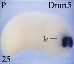 dmrta2 (DMRT-like family A2) gene expression in Xenopus laevis embryo, assayed via in situ hybridization, NF stage 25, lateral view, anterior right, dorsal up.