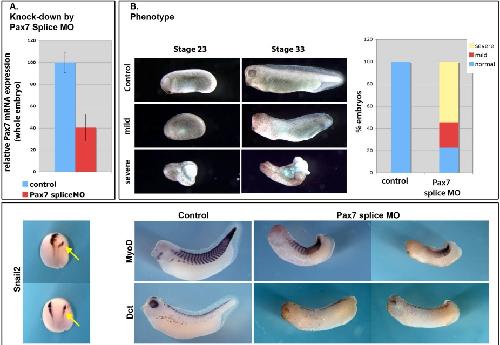Sup. Fig 6. Pax7 splice MO phenotype. A splice-blocking morpholino was designed (see Supplemental Fig. 2). Injections in whole embryos were monitored for pax7 expression by semi-quantitative RT-PCR followed by phospho-imager analysis. This shows that the Pax7 splice MO decreases pax7 expression by 60% at the dose used here, at tailbud stage 22 (A). The morphology of the embryos (whole embryo injections) was similar to the one observed for Pax7MO (translation blocking MO) (B) with a slightly milder percent of severe embryos. Marker genes analyzed during neurulation or later on displayed similar defects as those observed with the Pax7MO (see Fig. 6). Image published in: Maczkowiak F et al. (2010) Copyright © 2010. Image reproduced with permission of the Publisher, Elsevier B. V. Larger Image Printer Friendly View |