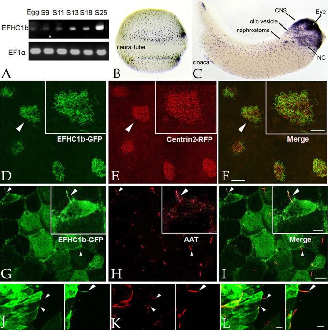 Fig. 1. EFHC1b is associated with various types of cilia. A: An RT-PCR analysis during early development (stages indicated) revealed that EFHC1b RNA levels increase at the onset of gastrulation, confirming previous data from Yanai et al. accessed through the Xenbase website. EF1α RNA was used as an internal control. In situ hybridization reveals the presence of EFHC1b RNA in the ciliated cells of the embryonic epidermis in stage 18 embryos (B) and in a number of different tissues in tailbud stage (stage 33) embryos (C)(CNS: central nervous system; NC: neural crest). D–F: RNAs encoding EFHC1b-GFP and Cetn2-RFP were injected into fertilized eggs and ectodermal explants were generated and analyzed when intact embryos reached stage 24; EFHC1b-GFP (D) was localized to the axonemes and excluded from the basal body regions of the cilia in multiciliated cells (E, F)(see Fig. 2). Scale bar of main image: 20 µm; scale bar for inserts: 10 µm. G–I: The gastrocoele roof plate regions of EFHC1b-GFP RNA injected, stage 19 embryos were dissected and probed with antibodies against GFP (G) and acetylated-α-tubulin (AAT)(H,I-merged image). Individual GRP cilia are indicated by arrowheads. Scale bar of main image: 15 µm; scale bar for inserts: 8 µm. J–L: At stage 26, a section through the neural tube region of an EFHC1b-GFP RNA injected embryos were stained for EFHC1b-GFP (J) and AAT (K, L-merged image); arrowheads indicate primary cilia. Other AAT structures may be neuronal axons or radial glia. Scale bar of main image: 10 µm; scale bar for inserts: 5 µm.