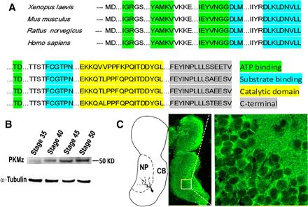 Figure 1. Characterization of Xenopus PKMz. A, Alignment of predicted PKMz amino acid sequences from Xenopus laevis and other species. Regions corresponding to postulated major motifs are highlighted. B, Western blot using an antibody raised against the catalytic domain of rat PKMz identifies a 50 kDa protein from Xenopus brain extracts, demonstrates a progressive developmental increase in expression. C, Schematic drawing of tadpole brain (left) and horizontal section stained with PKMz antibody demonstrating enriched immunoreactivity in the neuropil region (NP) and the membrane portion of cell body (CB) region of the tectum.