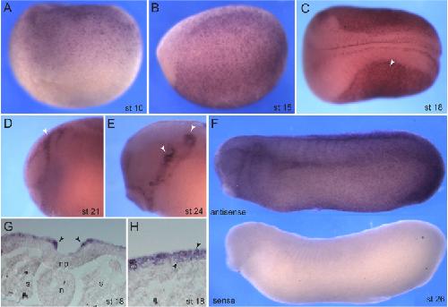 Fig. 2. Expression of prickle3 transcripts in Xenopus early embryos. Embryos were subjected to whole-mount in situ hybridization with Pk3 anti-sense RNA probe or sense probe as a control. Pk3 transcripts are present in the animal pole ectoderm of stage 10 gastrulae (A), and non-neural ectoderm of stage 15 neurulae (B). (C) Stage 18 embryo. Epidermal ectoderm is strongly positive (arrowhead), as compared to neuroectoderm. (D) Stage 21 embryo, anterior region, with staining in the profundal and posterior region placodes (arrowhead). (E) Stage 24 embryo, the otic vesicle and the posterior placodal region are positive (arrowheads). (F) Stage 26 embryos, tailbud. An embryo hybridized with the sense probe is shown on bottom. Anterior is to the left. Lateral view is shown in all panels, except dorsal view in C. (G, H) Cross-sections of stage 18 embryos. Arrowheads point to the staining in neural folds (G) and in both inner and outer layers of the epidermis (H). Positions of nuclei in the epidermis are outlined by dotted lines. Abbreviations: n, notochord, s, somites, np, neural plate. Image published in: Ossipova O et al. (2015) Copyright © 2015. Image reproduced with permission of the Publisher, Elsevier B. V.
