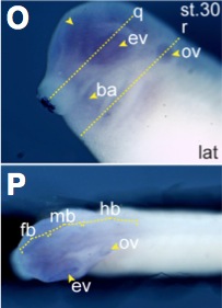 rnmt RNA (guanine-7-) methyltransferase) gene expression in Xenopus laevis embryo,head and trunk regions, assayed via in situ hybridization, NF stage 29 & 30, (O) lateral view, anterior left, dorsal up, and (P) dorsal view, anterior left. This image is extracted from figure published in: Lokapally A et al. (2016), Image published in: Lokapally A et al. (2016) Copyright © 2016. Image reproduced with permission of the Publisher, University of the Basque Country Press.