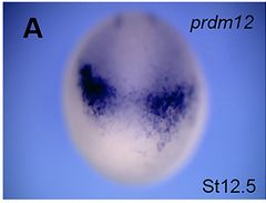 prdm12 (PR domain containing 12) gene expression in Xenopus laevis embryo, assayed via in situ hybridization, NF stage 12.5, anterior view, dorsal up. This image is extracted from figure published in: Thélie A et al. (2015), Image published in: Thélie A et al. (2015) Copyright © 2015. Image reproduced with permission of the Publisher and the copyright holder. This is an Open Access article distributed under the terms of the Creative Commons Attribution License.