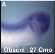 obscn (obscurin, cytoskeletal calmodulin and titin-interacting RhoGEF ) gene expression in Xenopus laevis embryo, assayed via in situ hybridization, NF stage 27, lateral view, anterior right, dorsal up. Image published in: Hooker L et al. (2012) Copyright © 2012. Image reproduced with permission of the Publisher, John Wiley & Sons.