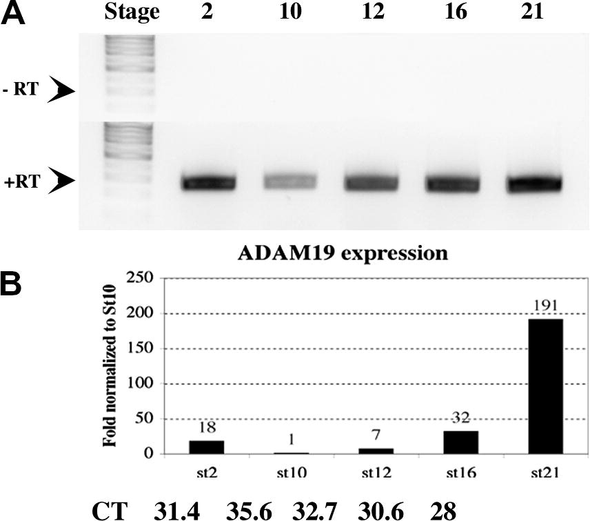 Fig. 1. ADAM19 expression. Quantitative real-time PCR expression of ADAM19 during early Xenopus development. Polyadenylated RNA from 2.5 embryos was used to make cDNA. PCR amplification was performed on a light cycler for 40 cycles. (A) The amplification product from both the control (âRT) and the experimental (+RT) were separated on a 2% agarose gel. (B) The relative abundance of the ADAM19 mRNA was measured by the 2(-δCT) method using stage 10 as a value of 1. Values are not adjusted to a control gene but to identical number of embryos. The CT values for each reaction are given below the graph. No CT values were obtained for the âRT control of each stage. ADAM19 mRNA is present as a maternal transcript at stage 2. Zygotic transcription starts during gastrulation and increases during neurulation (stage 16) continuing into early tailbud stage (stage 21). Image published in: Neuner R et al. (2009) Copyright © 2009. Image reproduced with permission of the Publisher, Elsevier B. V. Larger Image Printer Friendly View |
