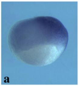 abl2 (ABL proto-oncogene 2) gene expression in Xenopus laevis embryo, assayed via in situ hybridization, NF stage 10, dorsal right, animal hemisphere up. This image is extracted from figure published in: Bonacci G et al. (2012), Image published in: Bonacci G et al. (2012) Copyright © 2012. Image reproduced with permission of the Publisher, Elsevier B. V.