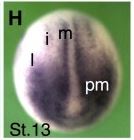 rbm38 ( RNA binding motif protein 38) gene expression in Xenopus laevis embryo, assayed via in situ hybridization, NF stage 13, dorsal view, posterior up. This image is extracted from figure published in: Bentaya S et al. (2012), Image published in: Bentaya S et al. (2012) Copyright © 2012. Image reproduced with permission of the Publisher, Elsevier B. V.