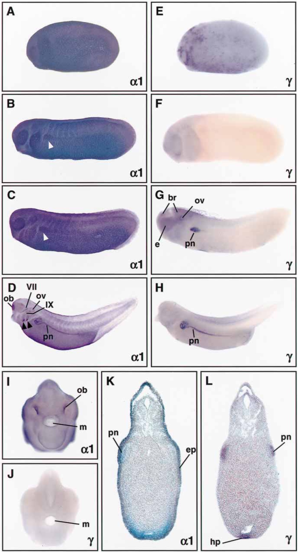 Fig. 3 Expression of Na,KATPase a1 and g subunit genes during Xenopus embryogenesis. Whole-mount in situ hybridizations were performed with antisense probes for a1 and g subunits. Transverse sections of stage 28 (K, L) were cut at 30–40 mm. Lateral views (A-H) are shown with anterior to the left. Frontal views (I, J) and sections (K, L) are oriented with dorsal to the top. A-D a1 subunit expression was found throughout the epidermis of tailbud embryos (A, stage 23; B, stage 26; and C, stage 28). Expression in the pronephric anlage can be anticipated from stage 26 on (white arrowheads). At stage 37, a1 transcripts were prominently detected in the olfactory bulbs, otic vesicles, the gills (arrowheads), the pronephric kidneys, and facial (VII) and glossopharyngeal (IX) nerves. E-H Stage 22 embryo (E) showed a punctate staining pattern for the g subunit. At stage 25 (F), g expression was overall low, but became at stage 28 (G) apparent in the brain, eyes, otic vesicles, and pronephric primordia. In the stage 38 embryo (H), strong expression of g transcripts was confined to the pronephric kidneys. I, J Frontal views of stage 37/38 embryos stained for a1 and g expression. Strong staining for a1 transcripts (J) was seen in the olfactory bulbs. K, L Transverse sections of stage 28 embryos revealed a1 (K) in the epidermis and g (L) expression in the pronephric and hepatic primordia. For abbreviations, see legend to Fig. 2.