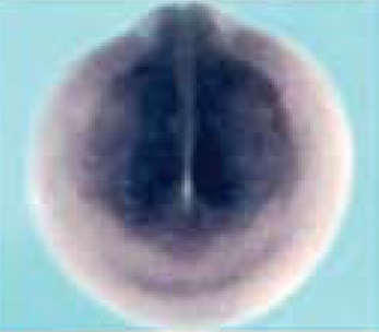 bzw2 (basic leucine zipper and W2 domains 2) gene expression in Xenopus laevis embryo, assayed via in situ hybridization, NF stage 19, anterior view, dorsal up.