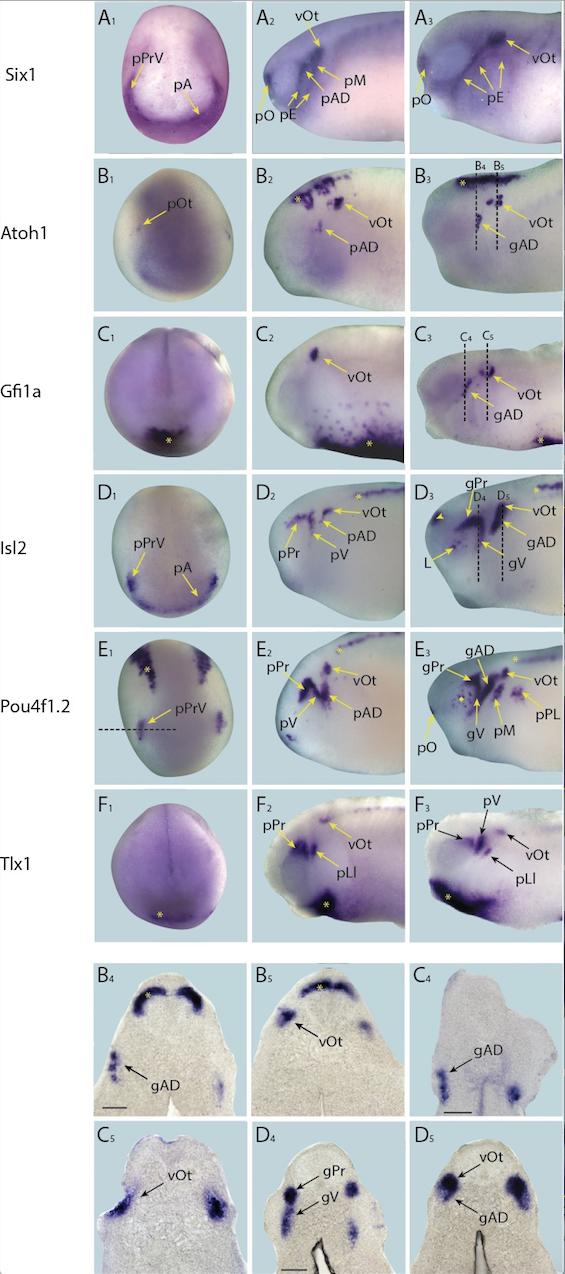 Expression dynamics for each target are shown across a range of developmental stages: A1âF1 show expression in neural plate stage embryos, A2âF2 show early tail bud stage embryos and A3âF3 show late tail bud stage embryos. B4âD4 and B5 âD5 shows sections at level indicated in B3âD3, respectively (dotted lines). (A) Expression of PPE marker gene Six1 is shown as reference for placodal domains (for details see Pandur and Moody, 2000; Schlosser and Ahrens, 2004). (B) Atoh1 is initially expressed at very low levels in presumptive otic placodes at neural plate stages (B1). This expression becomes more pronounced in the otic vesicle at early tail bud stages (B2) concomitant with the initiation of expression in lateral line ganglia and strong expression in the hindbrain (B2; asterisk). Expression becomes more pronounced in all three regions at late tail bud stages (B3 âB5). (C) Gfi1a is expressed at high levels in haematopoietic cells during neural plate stages (C1; asterisk). At early tail bud stages (C2) expression becomes more pronounced and diffuse, and expression is also initiated in the otic vesicle. At late tail bud stages Gfi1a is expressed in lateral line placodes as well as otic vesicles as the haematopoietic expression begins to subside (C3âC5). (D) During neural plate stages Isl2 is expressed in the profundal and trigeminal placodes and in the anterior placodal region along the anterior edge of the neural plate (D1). At early tail bud stages Isl2 expression is maintained in the profundal and trigeminal placodes/ganglia as well as in otic and lateral line placodes/ganglia and primary neurons in the spinal cord (D2; asterisk). Expression is maintained in cranial ganglia at late tail bud stages (D3âD5) and becomes apparent in the forebrain and lens (D3; arrowhead). (E) During neural plate stages Pou4f1.2 is expressed in the profundal and trigeminal placodes as well as in a stripe of primary sensory neurons (E1; asterisk; see Figure 4âfigure supplement 5 for section). In early tail bud stages (E2) expression in the profundal/trigeminal placodes/ganglia and primary neurons is maintained, and expression in the otic and lateral line placodes is strengthened. Expression is maintained in all domains as well as in the cranial ganglia derived from placodes into late tail bud stages when expression becomes up-regulated in the retina (E3; diamond). Dotted line in E1 indicates the level of section shown in Figure 4â figure supplement 5. (F) Tlx1 is expressed in the presumptive ventral visceral arches at neural plate stages (F1; asterisk). This is maintained into early and late tail bud stages (F2 and F3), which also exhibit prominent expression in the profundal/trigeminal placodes and ganglia and the otic vesicle. Yellow and black arrows mark placodal expression. Bar in B4, C4 and D4: 100 μm (also for B5, C5 and D5, respectively). Abbreviations: pA: anterior placodal region; pAD: anterior lateral line placode; gAD: ganglion of the anterodorsal lateral line nerve; pE: epibranchial placode; pLl: lateral line placodes; L: lens; pL: lens placode; pM: middle lateral line placode; pO: olfactory placode; vOt: otic vesicle; pOt: presumptive otic placode; pPr: profundal placode; pP: posterior placodal region; pPL: posterior lateral line placode; pPrV: profundal/trigeminal placodes; pV: trigeminal placode; gV: ganglion of the trigeminal nerve. Image published in: Riddiford N and Schlosser G (2016) © 2016, Riddiford et al. Creative Commons Attribution license