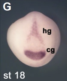 dnajb11 (DnaJ heat shock protein family (Hsp40) member B11) gene expression in Xenopus laevis embryo, assayed via in situ hybridization, NF stage 18, anterior view, dorsal up. This image is extracted from figure published in: Pera EM et al. (2005), Image published in: Pera EM et al. (2005) Copyright © 2005. Image reproduced with permission of the Publisher, University of the Basque Country Press.