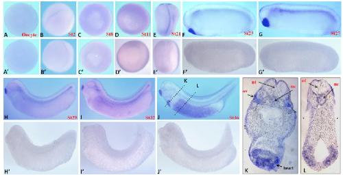 Fig. 2. Spatial patterns of rrbp1a [rrbp1.L] analyzed by whole mount in situ hybridization. (A and Aâ²) Oocyte. (B and Bâ²) Stage 2, animal view. (C and Câ²) Stage 8, animal view. (D and Dâ²) Stage 11, vegetal view. (E and Eâ²) Stage 21, dorsal view. (F and Fâ²) Stage 25, lateral view. (G and Gâ²) Stage 27, dorsal view. (H and Hâ²) Stage 29, lateral view. (I and Iâ²) Stage 32, lateral view. (J and Jâ²) Stage 36, lateral view. (K and L) Transverse sections of embryos at the levels illustrated by black broken lines in J. Nc, notochord; nt, neural tube; ov, otic vesicle. Aâ²-Jâ² indicates the sense probe control. Image published in: Liu GH et al. (2017) Copyright © 2017. Image reproduced with permission of the Publisher, Elsevier B. V.
