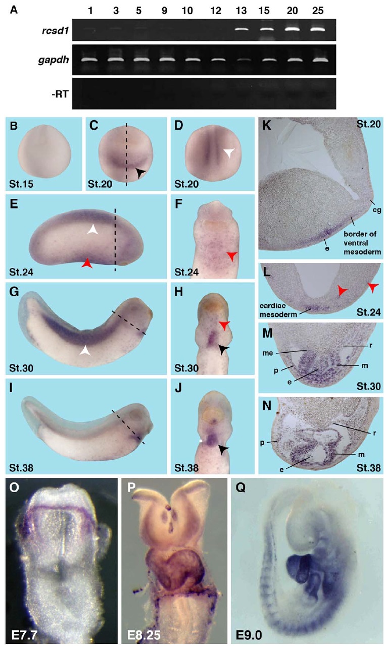 and 38 (N, transversal section). e, endocardium; m, myocardium; me, mesocardium; p, pericardium; r, pericardial roof. O-Q Expression of Rcsd1 during mouse embryogenesis. Rcsd1 is expressed in the developing murine heart at embryonic stages E7.7 (O), E8.25 (P) and E9.0 (Q). Image published in: Hempel A et al. (2017) Copyright © 2017. Image reproduced with permission of the Publisher, Elsevier B. V.