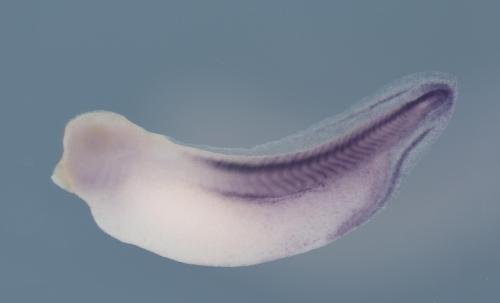 hoxa9 (homeobox A9) gene expression in Xenopus laevis embryo, assayed via in situ hybridization, NF stage 33, lateral view, anterior left, dorsal up.