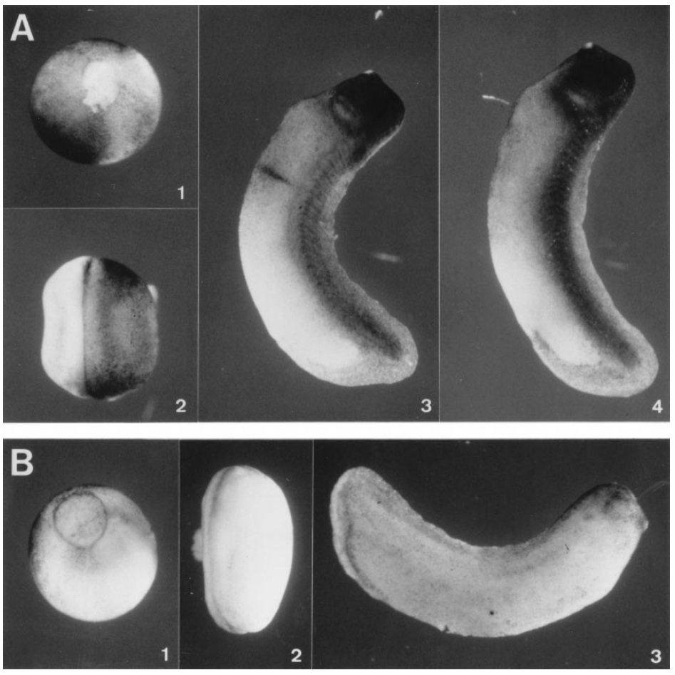 Fig. 5. Localization of XL43 and XL75 mRNA in early Xenopus embryos by whole-mount in situ hybridization. (A) Antisense riboprobes. 1: