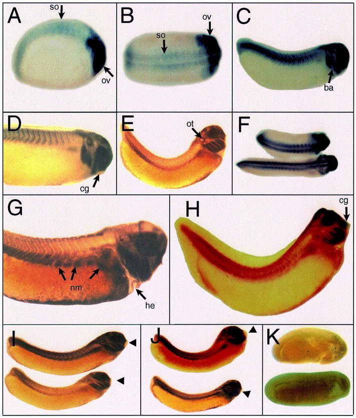 Fig. 2. Whole-mount in situ hybridization. Whole mount in situ hybridization with XlrpS1c was performed on Xenopus embryos at different developmental stages. (A) Neurula (stage 20), lateral view; (B) Early tailbud (stage 23) dorsal view; (C) Late tailbud (stage 27); (D, E) Hatching (stage 32), lateral view; (F) dorsal view of tailbud and hatching embryos; (G) Swimming tadpole (stage 35); (H) Swimming tadpole (stage 35 with double color in situ for XlrpS1c (red) and xJ1 (blue). (I, J) Whole mount in situ hybridization was performed on hatching stage (stage 32) embryos with ribosomal protein cDNA S22 (I), L1 (J, upper embryo) and L5 (J, lower embryo). (K) Negative control with sense XlrpS1c probe; early tailbud (stage 23) and late tailbud (stage 27), lateral views. so, somite; ov, optic vesicle; ba, branchial arches; cg, cement gland; ot, otic vesicle; he, heart; nm, nephrogenic mesoderm; hg, hatching gland. Arrowheads point to cement gland. Magnifications are as follows: A, B (30Ã); C, D, I, J (15Ã); E, F (10Ã); G, H (20Ã). Image published in: Scholnick J et al. (1997) Copyright © 1997. Image reproduced with permission of the Publisher, Elsevier B. V.