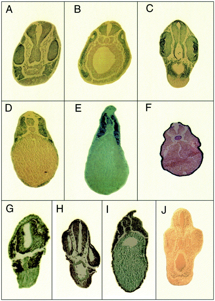 Fig. 3. Histological analysis of XlrpS1c expression. Following completion of the in situ hybridization procedure with an XlrpS1c probe (AâE), a cytokeratin probe (F) or an EF-1a probe (GâI), embryos were sectioned transversely at the level of the anterior neural tube/eye region (A, C, G, H), otic vesicles (B), mid-spinal cord (D, F), or tailbud (E, I) and the resulting sections photographed with bright-field optics. Stages of embryos were as follows: A, B, G, H, late tailbud (stage 25â27); C, D, E, F, I, hatching (stages 32â34). J depicts an anterior (optic level) section through a hatching stage (stage 32) embryo which was hybridized with a the sense XlrpS1c probe as a negative control. Nt, neural tube; ov, optic vesicle, ep, epidermis, ot, otic vesicle, ba, branchial arches; le, lens; ey, eye; cg, cement gland; no, notochord, so, somite. Magnifications are as follows: A, B, C, H (50Ã); D, G, I (60Ã); E (70Ã); F (40Ã). Image published in: Scholnick J et al. (1997) Copyright © 1997. Image reproduced with permission of the Publisher, Elsevier B. V.