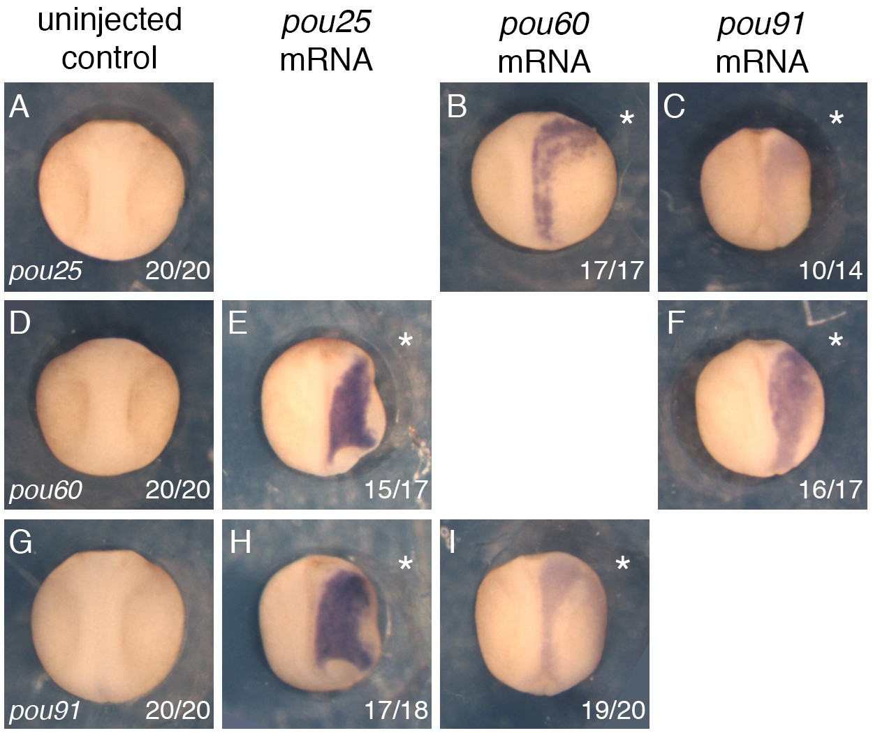 Whole-mount RNA in situ hybridization for epidermal (A-H) and neural crest (I-L) marker gene expression at stage 16; dorsal view, anterior up. Individual mRNAs for pou5f3 family members were injected unilaterally into the embryos shown here. Representative images are shown for epidermal keratin (epi ker, A-D), gata2 (E-H), and snai2 (I-L). Asterisks in images indicate injected side; arrows indicate partial loss of expression; arrowheads indicate posterior shifts in expression. Values in the lower right of each panel indicate the number of embryos with the depicted expression pattern.