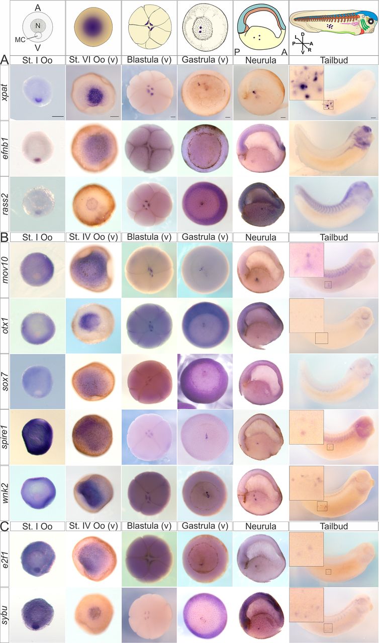 Fig. 3. WISH of vegetal pole transcripts. The expression of a subset of vegetally enriched mRNAs was analyzed during oogenesis and embryo development by WISH. Expression patterns are grouped according to mRNA pathway: early (A), late (B) or both (C). xpat expression marks germ plasm. Probes, developmental stages and developmental structures are indicated in the illustrations at the top: germ plasm/PGCs (purple), pronephros (pink), ventral blood islands (lime green), eye (black), lens (white), otic vesicle (gray), cranial ganglia (yellow), brachial arches (green), nasal placodes (teal), intersegmental region (brown), notochord (orange), brain and neural tube (blue). Transcripts detected in PGCs at the tailbud stage are shown at higher magnification in insets. WISH analysis was performed on ≥40 total embryos from at least two adult female frogs. Dorsal (D), ventral (V), left (L), right (R), posterior (P), anterior (A), vegetal view (v); MC, mitochondrial cloud; N, nucleus; Oo, oocyte. Scale bars: 100 μm for stage I oocyte; 200 μm in remaining panels.