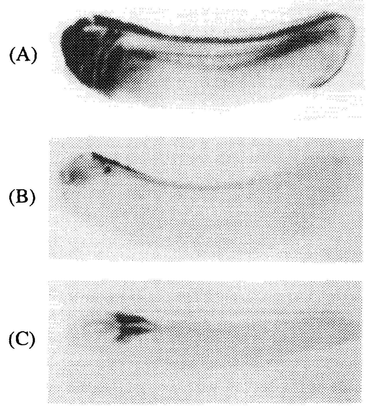 Fig. 3 Distribution of X-ptf-a and X-ptf-B transcripts in tailbud stage embryos. A digoxigenin-labeled cRNA probe was prepared by in vitro synthesis using SP6 RNA polymerase from the X-ptf-a or X-ptf-B coding regions on pSP64-poly(A). Whole mount in situ hybridization transcript distribution from the side. (B) and (C) X-ptf-B transcript distribution from the side and top, respectively.