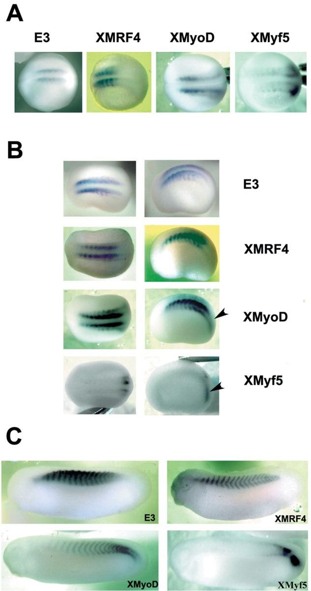 Figure 2. Whole-mount in situ hybridization at stage 18-19 (A) 21-22 (B), and 27-28 (C) with labeled antisense probes against XMRF4, XMyf5, XMyoD, and embryonic MHC E3 mRNAs. The same results were obtained using the three MRF4 probes. The anterior side of the embryos is on the left. Lateral view (C, right in B), dorsal view (A, left in B). Arrowhead: posterior unsegmented mesoderm